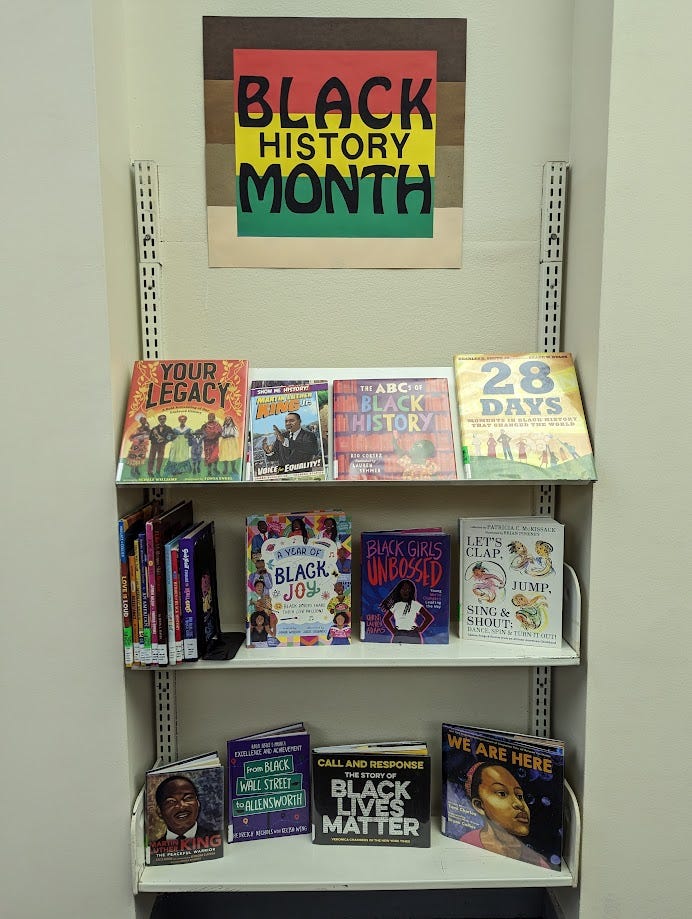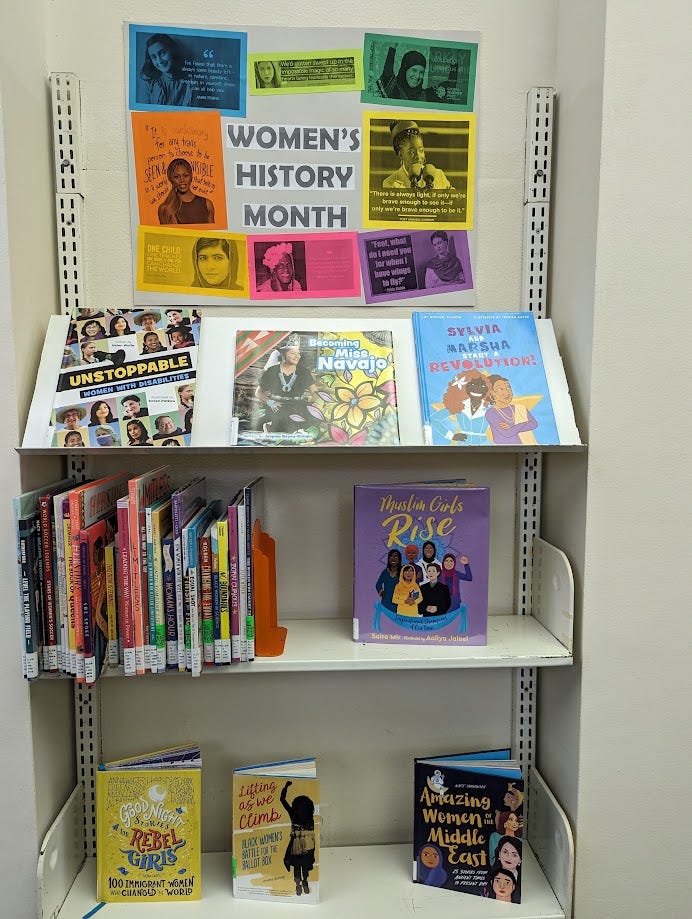 You can take that idea one step further and make an eye-catching collage. This one was for women’s history month. All of the images on the sign are simply quotes and photos found online, printed out and collaged. The center is just typed in a bold font using MS Word, then cut out on a paper cutter.