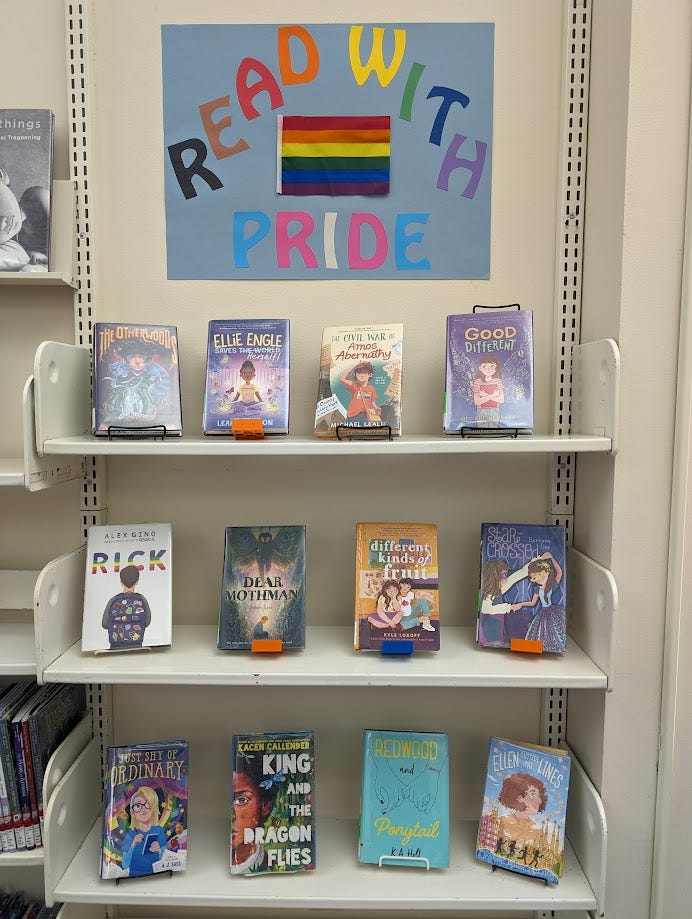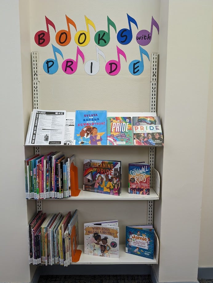 Speaking of MS Word: Our summer theme was music, so I decided to use that to make this pride display. I found a music note image, then put that in MS Word with a text box on top of it to position each letter. Then I just cut them out with scissors and taped them to the wall (using painter’s tape, of course… don’t damage your paint!).